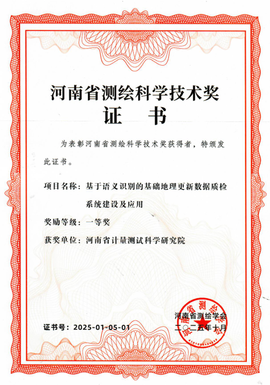 近日,河南省计量院(有限公司)的科研项目——“基于语义识别的基础地理更新数据质检系统建设及应用”,荣获河南省测绘科学技术奖一等奖,填补我省在基础测绘产品检验软件开发领域的空白。